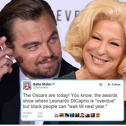 As conversation continues to swirl around Leonardo DiCaprio’s under-appreciated thespianism, Bette Midler has issued a pointed reminder about the Academy Awards’ continual failure to recognize black actors of equal mettle.
