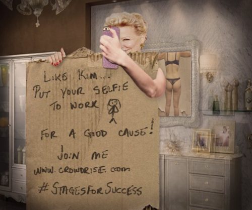 Midler looks nearly nude in the selfie as she hides behind a cardboard sign with the message: “Like Kim …put your selfie to work for a good cause. Join me at CrowdRise.com #StagesForSuccess.”