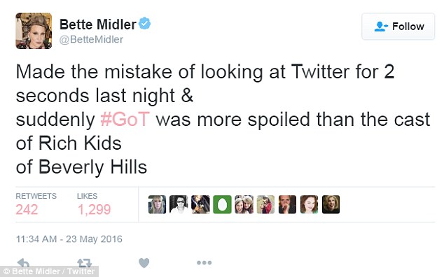 And on Monday the 70-year-old shared her disappointment with a joke as she revealed that a particularly poignant episode was ruined after she made the mistake of looking at Twitter, describing it as ‘more spoiled than the cast of Rich Kids Of Beverly Hills.’