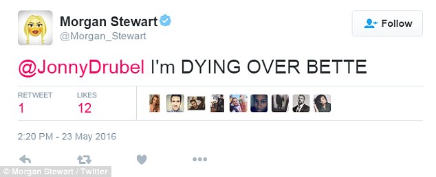 Morgan then called co-star Jonny into the fray, calling attention to the show’s mention as she wrote to him: ‘@JonnyDrubel I’m DYING OVER BETTE.’