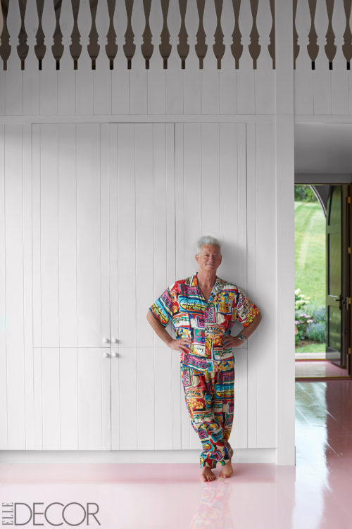 In keeping with the barefoot-bohemian vibe, there isn’t much furniture (painted cabinetry hides the appliances), but such spareness lends a magical intimacy to the centerpiece–a huge U-shaped built-in sofa tucked into a wallpapered carrel and bedecked with pillows in Kintisch’s digitally printed fabrics. “I tend to be a little more conservative than Martin is, because some clients just won’t go that far. It’s such a pleasure to work with him, because he pushes me to the edge. He’s never afraid,” says Kintisch, who has collaborated with von Haselberg for more than 35 years, on houses in Los Angeles and Laguna Beach as well as a penthouse apartment in Manhattan.