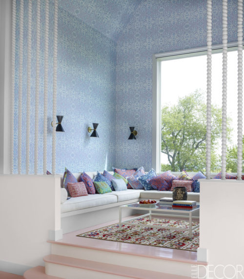 In the raised sitting area, the patterned wallpaper and cushion fabrics are by Nancy Kintisch and the sconces are by Atelier de Troupe.