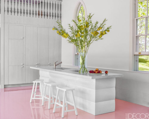 But even the Murphy house didn’t have this: floors lacquered in baby pink. “I was thinking of painted floors, and I told Nancy, ‘Let’s do something joyful and very feminine.’ When she suggested pink, I was all in,” he says. The floors are only the opening salvo, however. Walls and doorframes in the lofty space are a creamy white and washed seafoam. An island in the open kitchen is topped with pale green cerused white ash; its base is made “to look like stacked sticks of melting butter.” Nearby stands an oval dining table surrounded by Arne Jacobsen chairs in lime and lemon. The beamed ceiling–35 feet at its peak–is what Kintisch calls “cat belly lavender.”