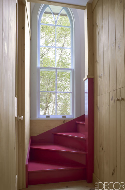 The stairway walls are of treated pine, and the stairs are painted a custom red by Fine Paints of Europe.