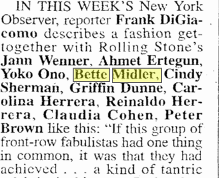 Bette Midler. Yoko Ono, Jann Wenner, Rolling Stone, Fashion Weekend