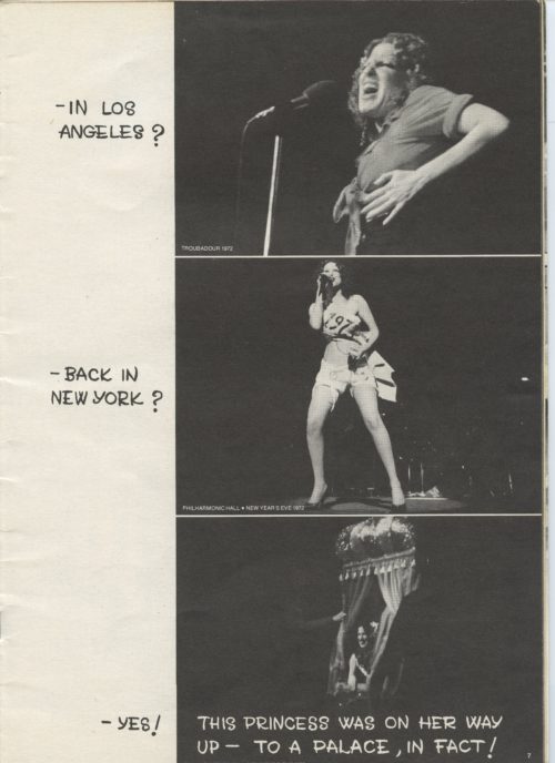 This 5-foot-l bundle ot unharnessed energy did just about everything imaginable in belting out four decades of pop music, filling in with conversational continuity that ranged from real raunchy humor to sentimentalities, from hard satire to her strength as an able mimic, from drag queen status to the look of a Yiddish mama, and masking it all with an emotional, constant attempt to be entertaining and appealing to all people.