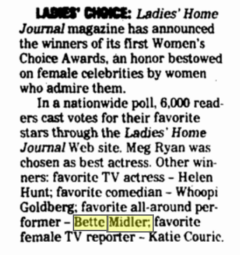 Bette Midler. Ladies Home Journal, Favorite Female Entertainer