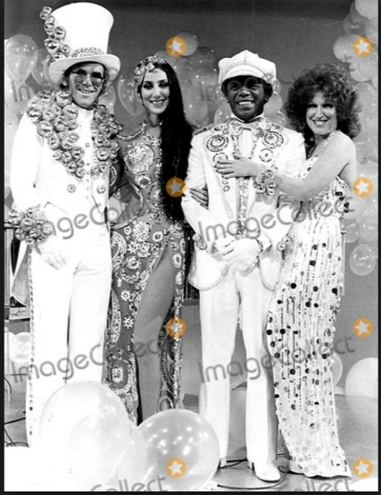 Music: Elton John sings hit version of the Beatle’s song “Lucy In The Sky With Diamonds” ; Bette Midler sings “Higher And Higher”; Bette Midler playing Sleeping Beauty and Elton John playing the Lone Ranger; dressed in girdles, garter belts and boas, Cher and Bette Midler camp it up in a medley that includes”I Wish I Could Shimmy Like My Sister Kate” and “Put The Blame On Mame” ; and, in another medley, Cher, Bette, Elton and Flip Wilson highlight the hour with “Mockingbird” “Proud Mary “Ainâ’t No Mountain High Enough” and “Never – Can Say Goodbye”