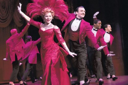 Which is not to say that she falls short of the role’s comedic demands. Her performance is less vivacious than Midler’s, but no less hilarious. With her deadpan comic line readings and subtle bits of physical business — the latter especially shown off in the riotously farcical hat shop scene in which she does not just a double, but a triple, take — she gets all the necessary laughs and more without lapsing into excessive shtick. Her vocals are equally stellar, and she looks sensational slinking down those Harmonia Gardens Restaurant stairs in that fabulous red dress and feathered headdress.