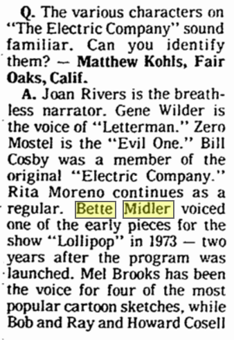 Bette Midler, The Electric Company, Lollipop, PBS, Sesame Street