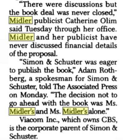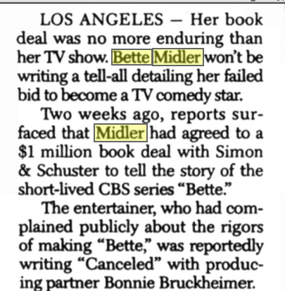 Two weeks ago, Bette Midler had agreed to a one million dollar book deal with Simon & Schuster to tell the story of the short-lived CBS series “Bette”