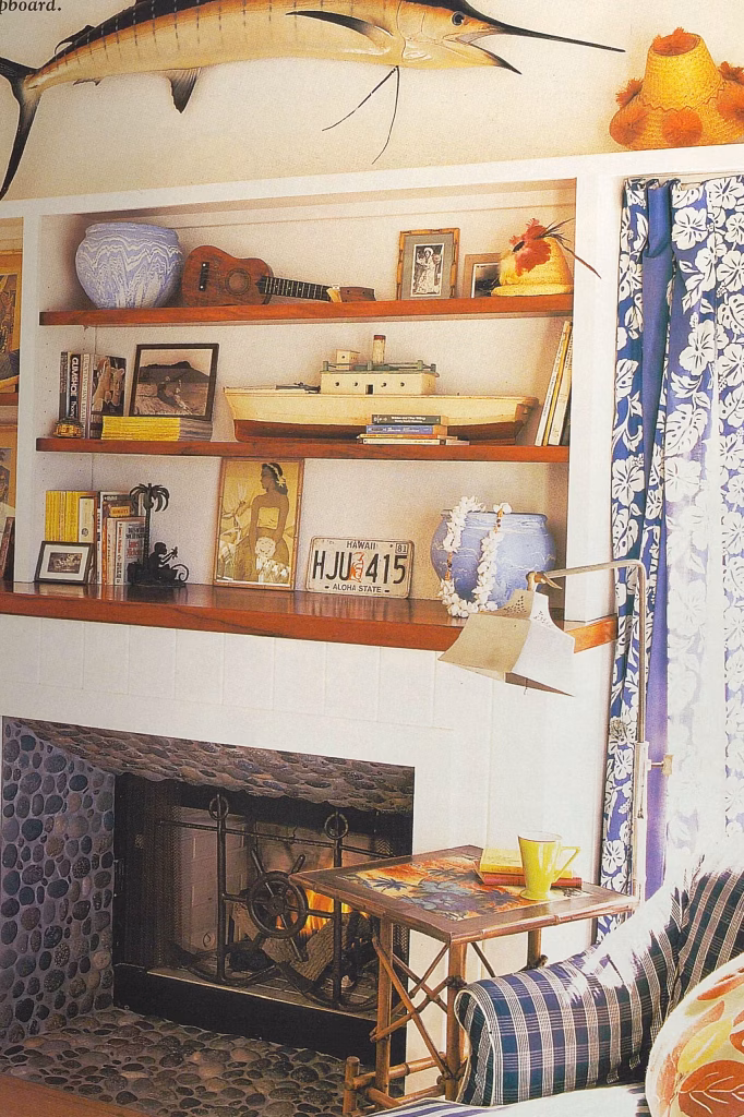 Hawaiian koa wood was used for the master bedroom bookshelves. Ralph Lauren mattress ticking and pareu cloth upholster the armchair next to Nancy Kintisch’s river rock-lined fireplace.
