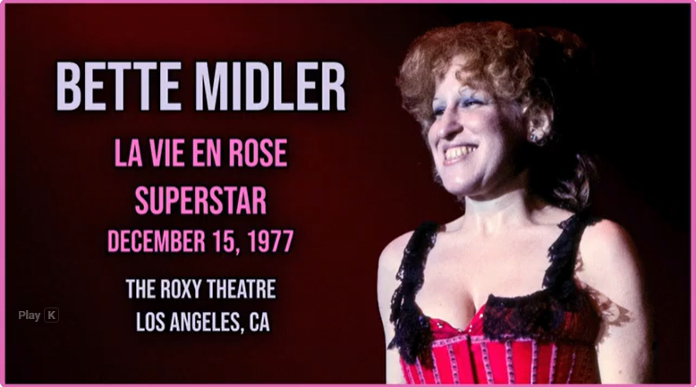 Bette Midler sings La Vie En Rose/Superstar at the Roxy Theatre in Los Angeles, CA on December 15, 1977 to a raucous crowd.