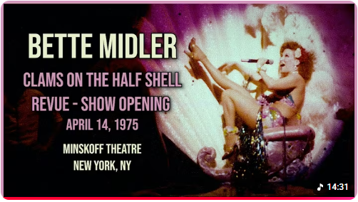 This is the opening of Bette Midler’s infamous Broadway show “Clams On The Half Shell Revue,” performed April 14, 1975, at the Minskoff Theatre in New York. Songs featured are “Moon of Manakoora” and “The Bitch Is Back”.