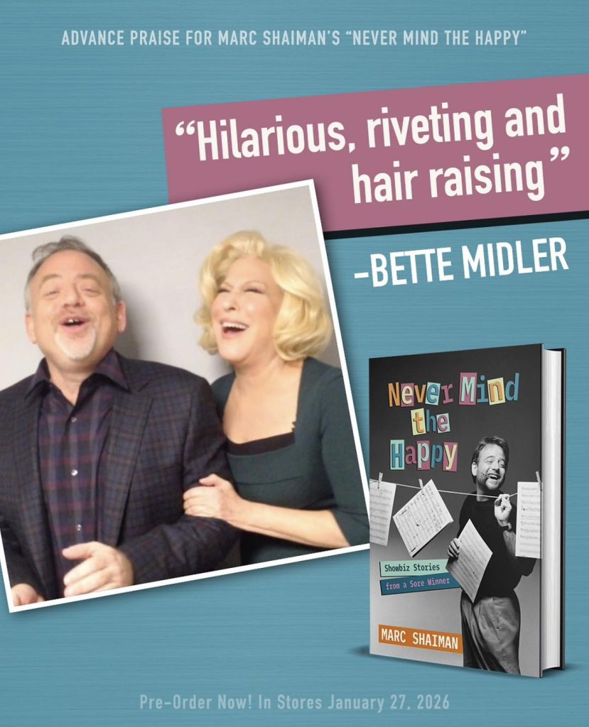 Now lands the miracle of one such worthy work by legendary music composer Marc Shaiman: Never Mind The Happy: Showbiz Stories From a Sore Winner.” And won he has: a couple of Grammys, two Emmys, and a Tony. (He’s just one Oscar short of an EGOT, though he has seven Academy Award nominations under his belt, too.)