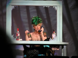 found Midler pedaling around the stage aboard a giant swan on wheels.