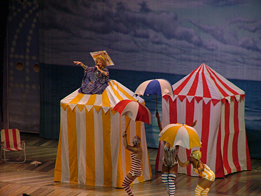 Huffing along a Coney Island boardwalk-themed stage, Midler barked